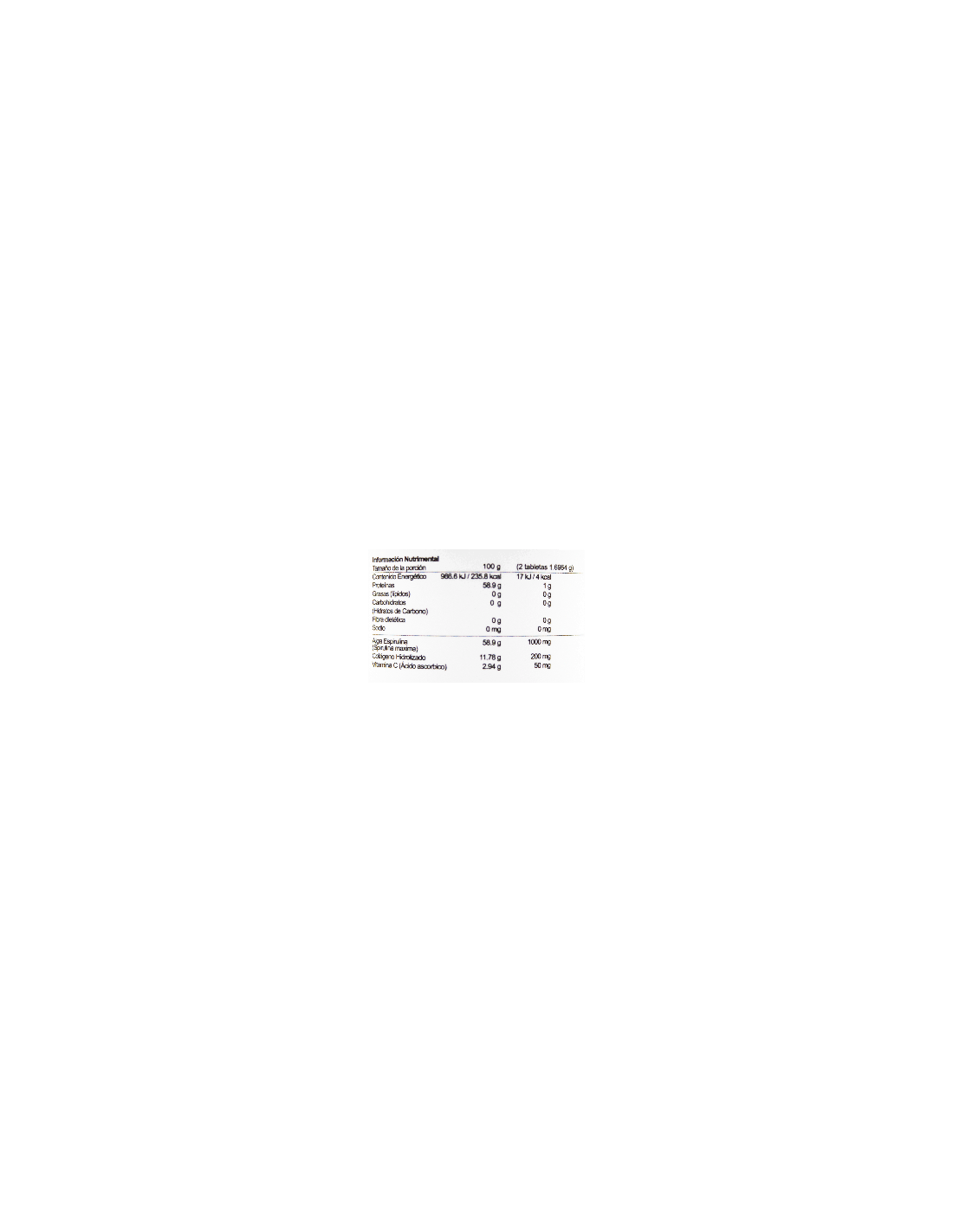 - Ingredientes: Alga espirulina (spirulina maxima), Colágeno Hidrolizado, Vitamina C (Acido ascorbico), Celulosa Microcristalina, Fosfato de calcio hidrogenado, Dioxido de Silicio, Glicolato sodico de almidon, Estearato de Magnesio.