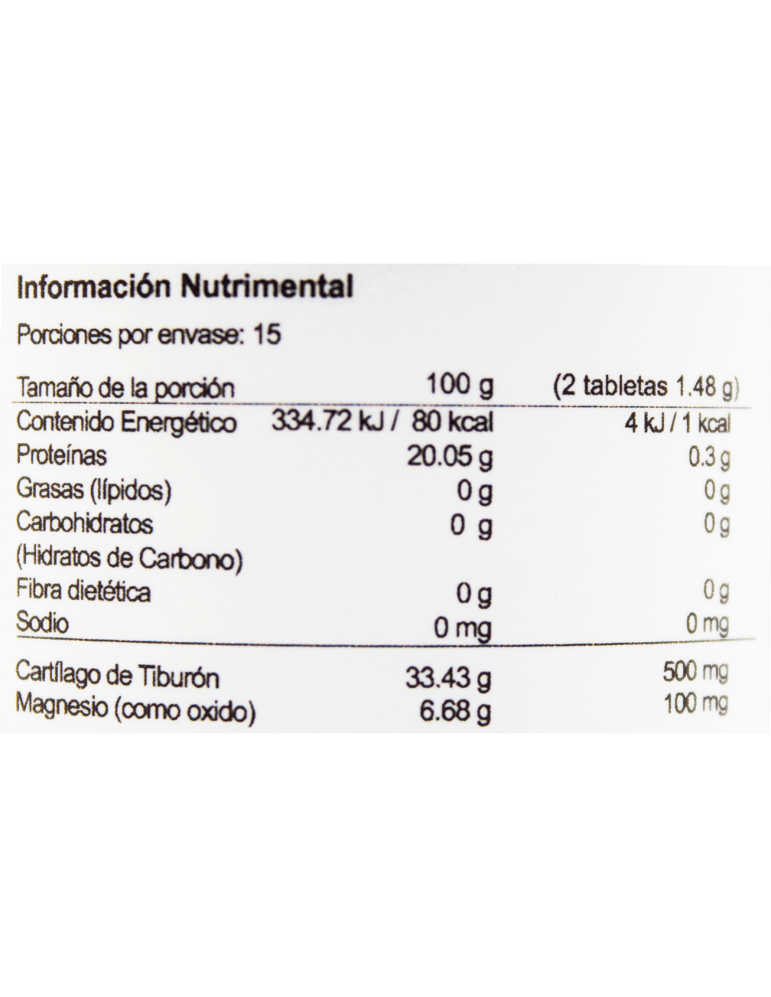 - Ingredientes: Cartílago de Tiburón, Magnesio (oxido) celulosa microcristalina, Glicolato sódico de almidón, Povidona, Aceite Vegetal Hidrogenado, Dióxido de silicio, Talco, Estearato de Magnesio.