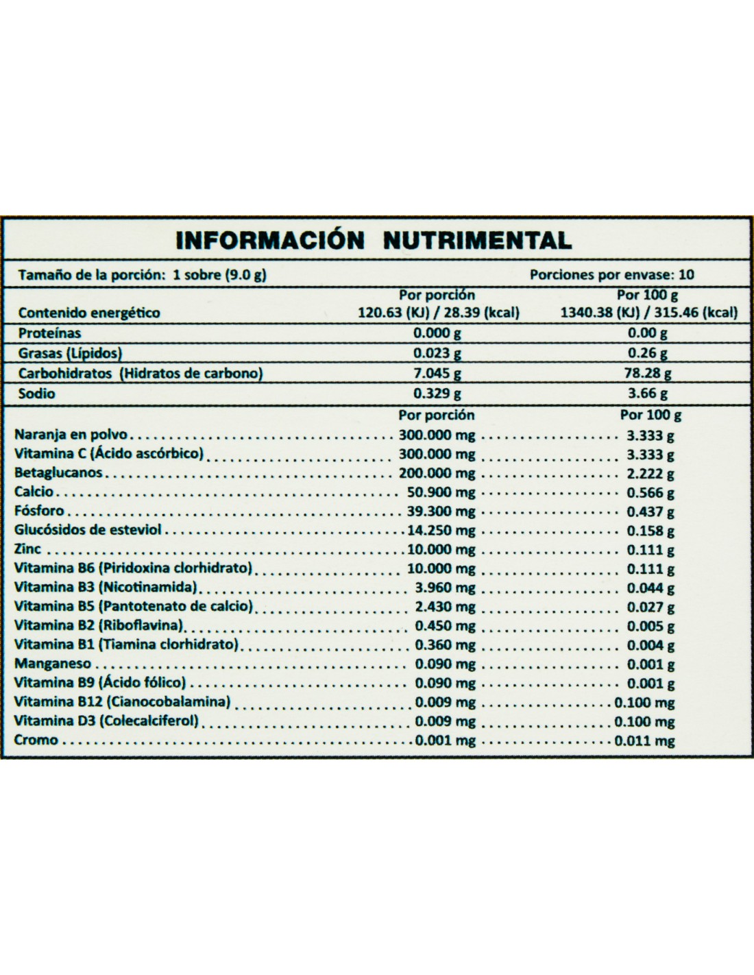 Ingredientes: Dextrosa aglomerada, Ácido Cítrico, Bicarbonato de Sódio, Sabor Naranja, Ácido Málico, Naranja en polvo, Ácido Ascórbico (Vitamina C), Sabor Mandarina, Betaglucanos, Fosfato Dibásico de Calcio, Sulfato de Zinc, Stevia, Piridoxina Clorhidrato (Vitamina B6), Nicotinamida (Vitamina B3), Amarillo #6, Pantotenato de Calcio (Vitamina b5), Riboflavina (Vitramina b2), Tiamina (Vitamina B1), Sulfato de Manganeso, Ácido Fólico (Vitamina B9), Cianocobalamina (Vitamina B12), Colecalciferol (Vitamina D3), Polinicotinaro de cromo.