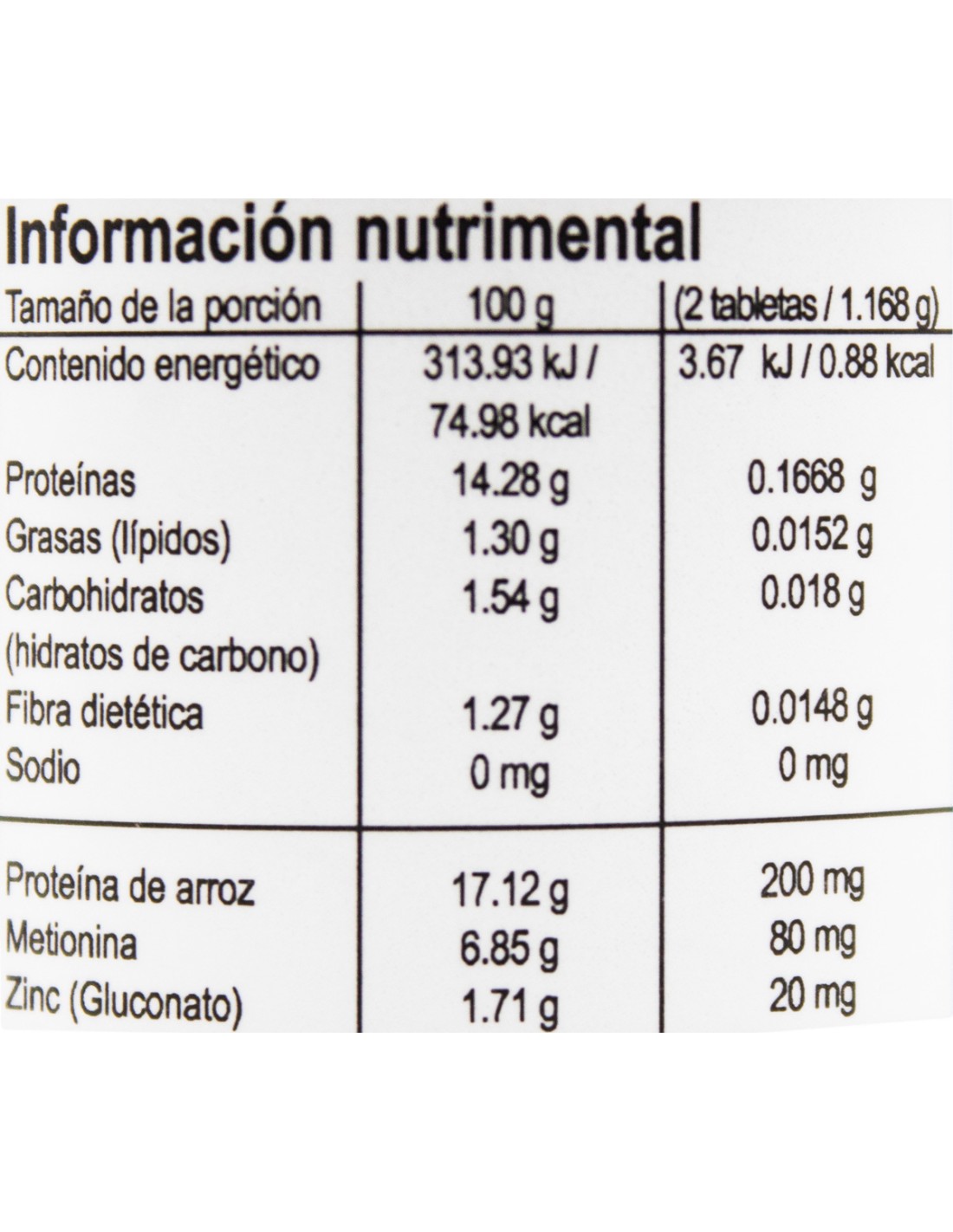- Ingredientes: Celulosa microcristalina, Proteina de arroz, Metionina, Zinc, Aceite Vegetal Hidrogenado, Laca aluminio café, Dióxido de silicio.