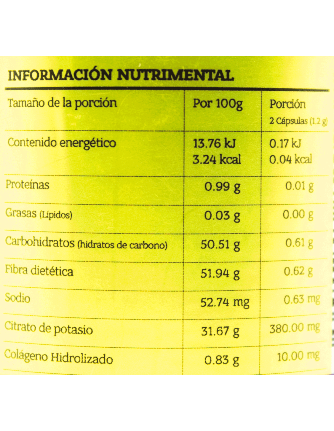 - Ingredientes: Celulosa microcristalina, Citrato de Potasio, Talco, Dióxido de silicio, Colágeno Hidrolizado.