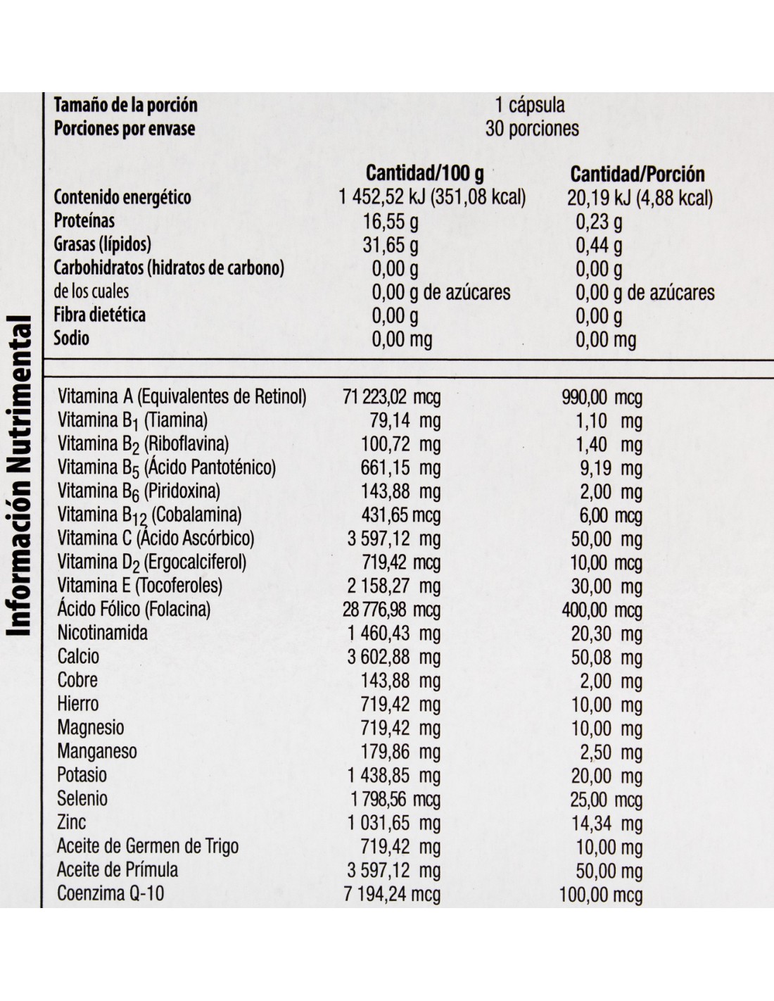 Ingredientes:Aceite de Soya (Glycine spp); Fosfato Dibásico de Calcio, Gluconato de Zinc; Ácido Ascórbico (Vit. C); Sulfato de Magnesio; Aceite de Prímula (Oenothera biennis L.); Sulfato de Potasio; Aceite Vegetal Hidrogenado (Manteca Vegetal); Acetato de dI-alfa Tocoferol (Vit. E); Levadura con Selenio; Nicotinamida; Lecitina de Soya; Pantotenato de Calcio (Vit. B5);Hierro Reducido; Aceite de Germen de Trigo (Triticum vulgare); Cera Blanca de Abejas; Dióxido de Silicio Coloidal; Sulfato de Manganeso; Sulfato Cúprico; Retinol (Vit. A Palmitato); Extracto de ajo en polvo (Allium sativum L.); Clorhidrato de Piridoxina (Vit. B6); Riboflavina (Vit. B2); Mononitrato de Tiamina (Vit. B1); Ácido Fólico; Biotina; Coenzima Q-10;Cianocobalamina (Vit. B12); Ergocalciferol (Vit. D2); De la corteza: Gelatina; Glicerina; Agua; Dióxido de Titanio Mezcla; Metilparabeno; Amarillo 6; Rojo 40; Amarillo 5; Propilparabeno; Azul 1.