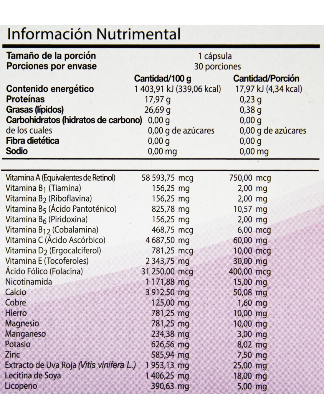 Ingredientes: Aceite de Soya; Fosfato Dibásico de Calcio; Ácido Ascórbico (Vit. C); Gluconato de Zinc; Licopeno; Acetato de dl-alfa Tocoferol (Vit.E); Aceite Vegetal Hidrogenado (Manteca Vegetal); Extracto de Uva Roja (Vitis vinifera L.); Cera Blanca de Abejas; Lecitina de Soya (Glycine soja); Sulfato de Potasio; Óxido de Magnesio; Nicotinamida; Pantotenato de Calcio (Vit. Bs); Hierro Reducido; Sulfato de Manganeso; Dióxido de Silicio; Sulfato Cúprico; Retinol (Vit. A Palmitato); Cloridrato de Piridoxina (Vit. B6); Mononitrato de Tiamina (Vit. B1); Riboflavina (Vit. B2); Ácido Fólico; Cianocobalamina (Vit. B12); Ergocalciferol (Vit. D2);Polidimetilsiloxano. De la corteza: Gelatina; Glicerina; Agua; Dióxido de Titanio; Rojo 40; Metilparabeno; Propilparabeno; Azul 1.