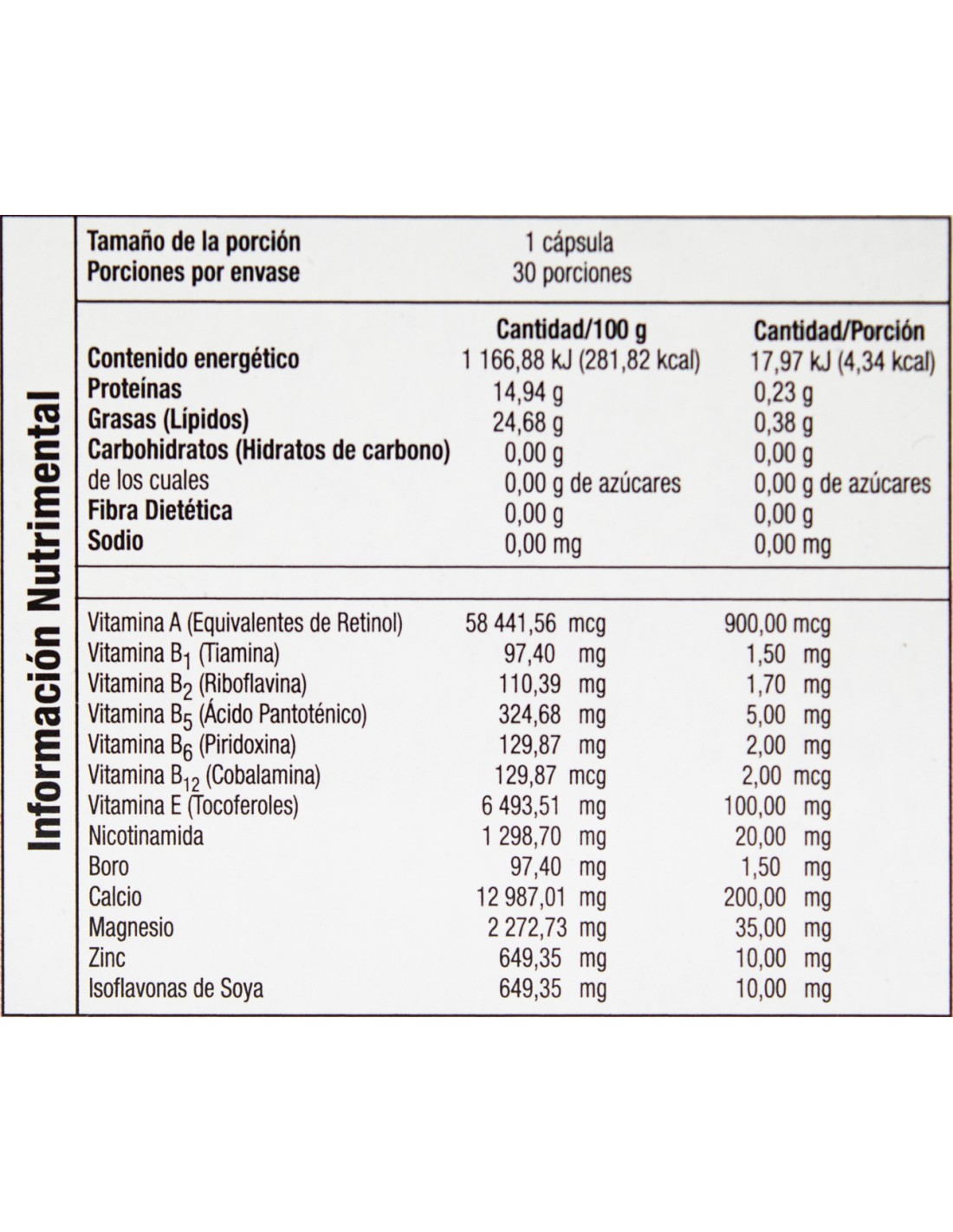 - Isoflavonas de Soya, Lecitina de Soya, Vitaminas y Minerales.
