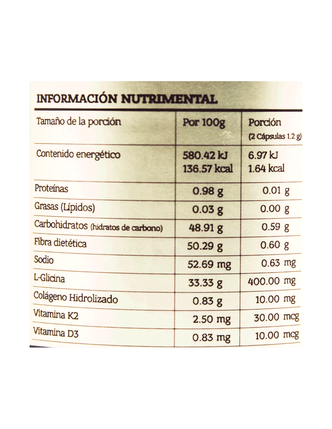 - Ingredientes: Celulosa microcristalina, L-Glicina, Talco, Dióxido de silicio, Colágeno Hidrolizado, Vitamina K2, Vitamina D3.